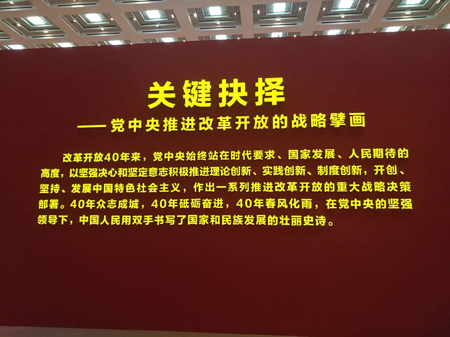 展览分为伟大的变革、壮美篇章、关键抉择、历史巨变、大国气象、面向未来六大展区。运用图片、文字、视频、实物场景、沙盘模型、互动体验等多种表现方式展示我国40年来的伟大变革与成就。