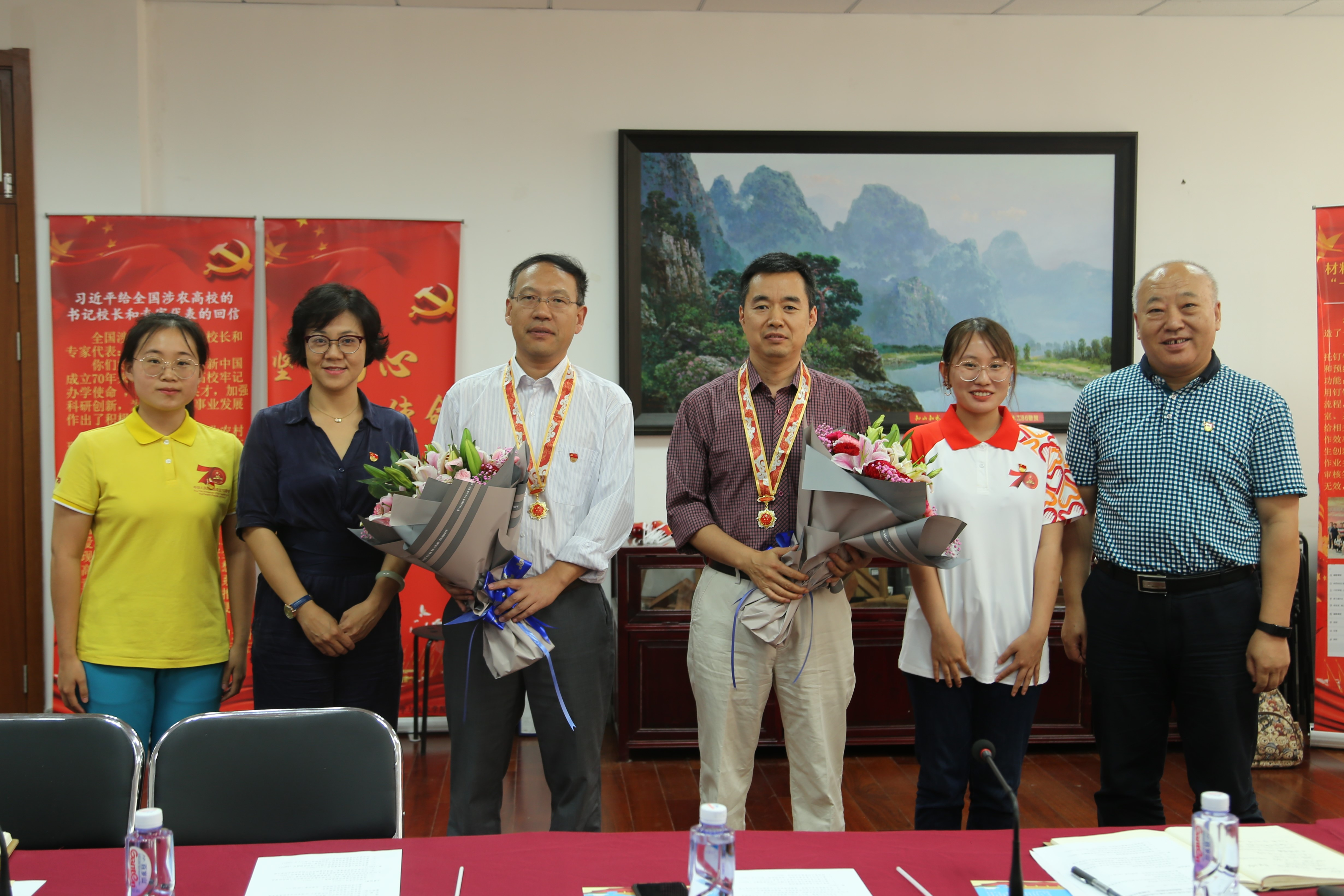 会议伊始,材料学院党委和行政负责人为获得庆祝中华人民共和国成立70周年纪念章的李建章教授、蒋建新教授颁发奖章,学生代表向两位教授献花。