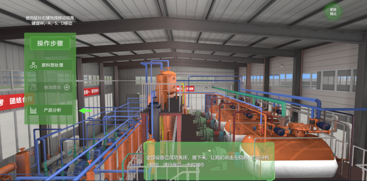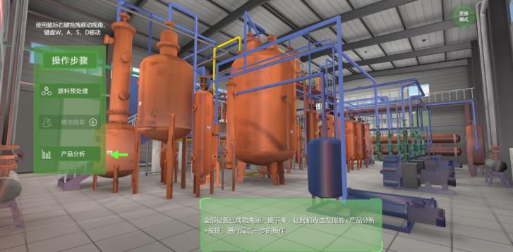 “林化综合实习”针对在林产化工厂实习一直面临实习风险高、成本高、企业不愿接纳学生实习等困难,并且学生没有机会在工厂进行实际操作,不能深入理解提取原理、生产流程、关键设备原理和结构的问题,本课程率先开发了《植物精油的亚临界流体提取技术仿真实验教学》软件(图1),以专业实践教学基地亚临界提取工厂为依托,结合教学团队的创新成果,利用三维建模、增强现实技术,逼真展现了亚临界提取工厂复杂的工艺流程、关键设备结构、设备与管道布局(图2),设置多种交互方式,增强学生主动参与度,实验条件与结果具有探究性和个性化。